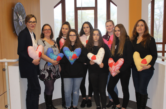 Seit 3 Jahren leitet Dilek Ince-Taspinar das Projekt „Herzen gegen Schmerzen“. Gemeinsam mit Schüler*innen näht sie in der Projektwoche vor den Sommerferien Kissen in Herzform. Diese Kissen helfen Frauen die an Brustkrebs erkrankt sind, die Schmerzen nach Operationen zu ertragen. Viele Kissen näht die Projektgruppe jedes Jahr.