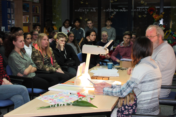 Im Anschluss durften Fragen gestellt werden. Nicoleta Craita Ten´o beantwortet sie alle. Mit Hilfe eines Overhead Projektors und Folienstiften schreibt sie ihre Antworten auf. Eine Schülerin wird zum Sprachrohr und liest sie vor. Neugierig sind sie, die Jugendlichen. Und tiefgründig. „Mehr als sonst“ sagt Verleger Alfred Büngen. Ob sie noch wisse, welches ihre letzten Worte gewesen sein, die sie mit 12 sagte. Oder wie Menschen in der Straßenbahn auf sie und ihre Puppe, die sie immer bei sich trägt, reagieren. Viele Schüler*innen wirken sehr ergriffen als sie sich am Ende der Lesung Bücher signieren lassen.